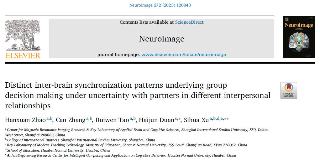 Zhao, H., Zhang, C., Tao, R., Duan, H.*, & Xu, S*. (2023). Distinct inter-brain synchronization patterns underlying group decision-making under uncertainty with partners in different interpersonal relationships. NeuroImage, 272, 120043. https://doi.org/10.1016/j.neuroimage.2023.120043