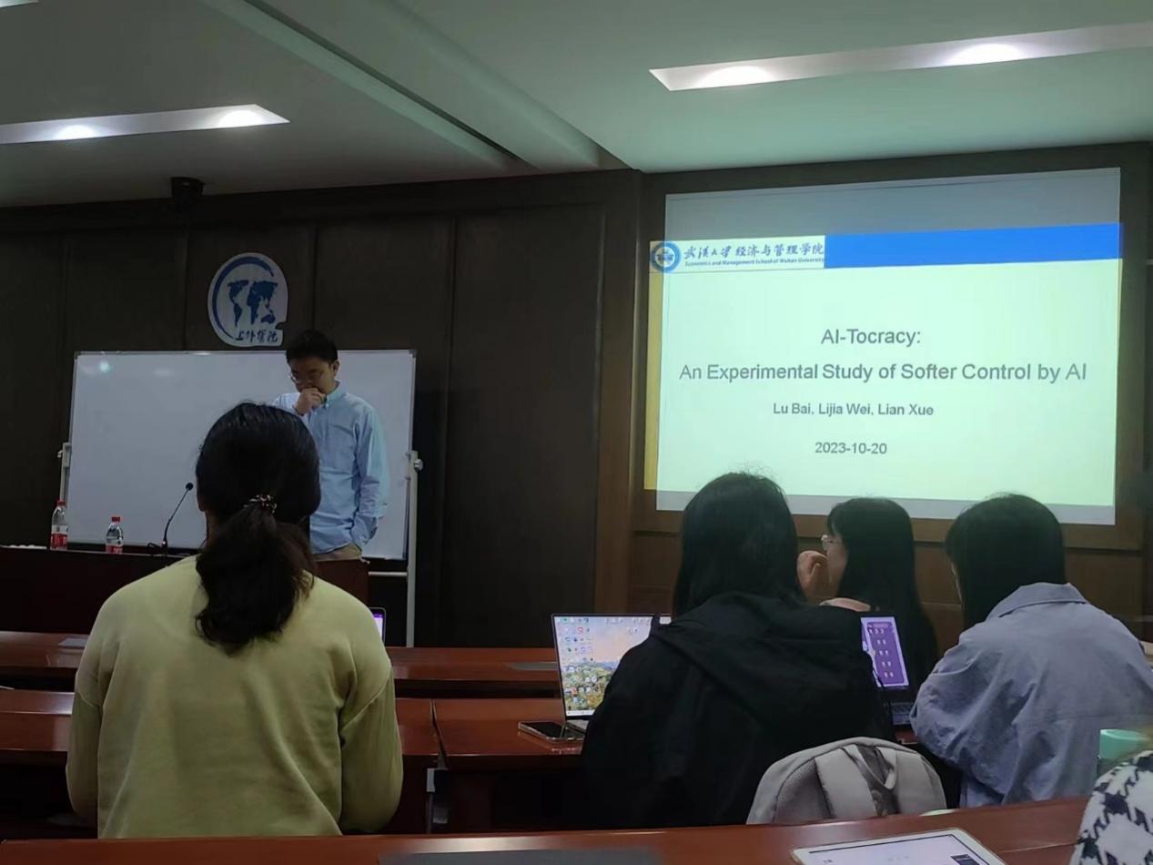 10月20日,武汉大学经济与管理学院教授魏立佳应邀为我院开展了一场主题为“AI-Tocracy: An Experimental Study of Softer Control by AI”的学术讲座。学院30余名师生到场聆听。讲座由高媚助理教授主持。