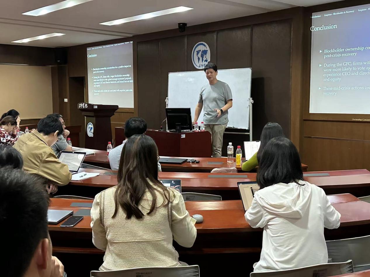 10月27日,复旦大学泛海国际金融学院助理教授周亦凡在松江校区2教楼220教室为我院开展了题为“Ownership Concentration and Crisis Recovery”的学术讲座,本次讲座由陈蓓老师主持,吸引了学院20余名教师和硕博研究生参加。