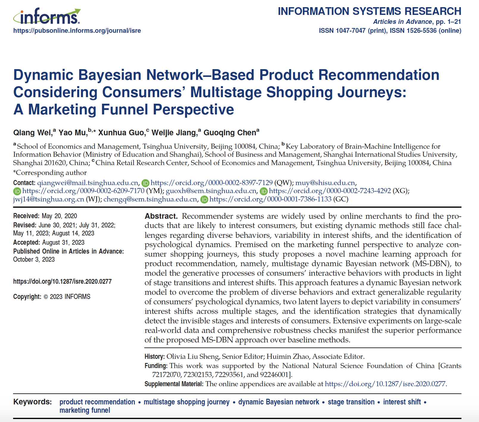 Qiang Wei, Yao Mu*, Xunhua Guo, Weijie Jiang, Guoqing Chen (2023) Dynamic Bayesian Network-Based Product Recommendation Considering Consumers’ Multistage Shopping Journeys: A Marketing Funnel Perspective. Information Systems Research Published online in Articles in Advance 3 Oct 2023. https://doi.org/10.1287/isre.2020.0277