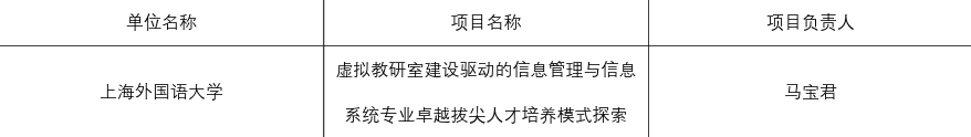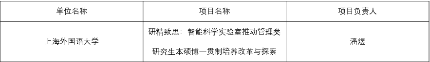 其中,潘煜教授的“研精致思:智能科学实验室推动管理类研究生本硕博一贯制培养改革与探索”获上海市研究生教育改革项目立项,马宝君教授的“虚拟教研室建设驱动的信息管理与信息系统专业卓越拔尖人才培养模式探索”获上海高校本科重点教改项目立项。