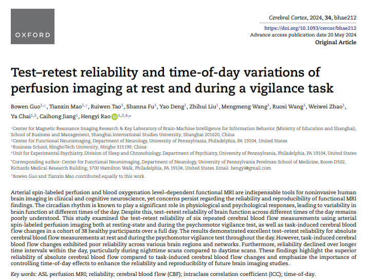 Guo, B.#, Mao, T.#, Tao, R., Fu, S., Deng, Y., Liu, Z., ... & Rao, H*. (2024). Test–retest reliability and time-of-day variations of perfusion imaging at rest and during a vigilance task. Cerebral Cortex, 34(5), bhae212. https://doi.org/10.1093/cercor/bhae212