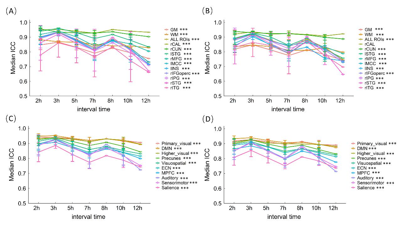 并且,对于大部分脑区及脑网络,相比于白天,晚上脑血流的平均重测信度降低。