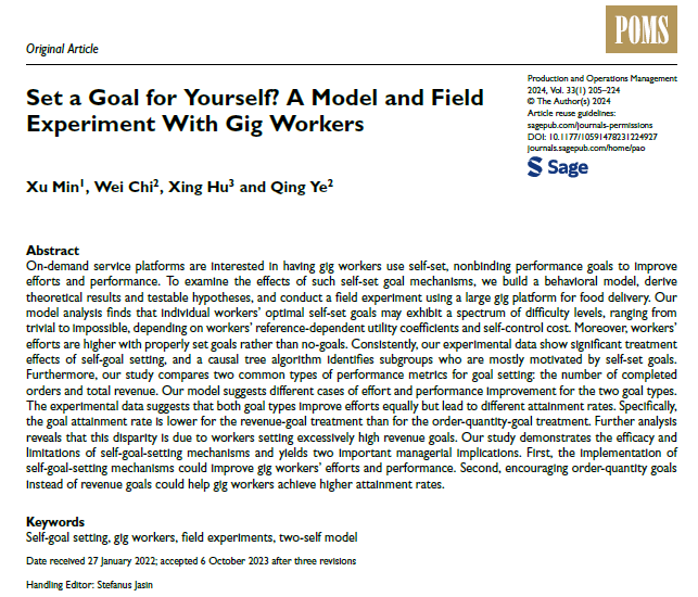 Min, X., Chi, W., Hu, X., & Ye, Q. (2024). Set a Goal for Yourself? A Model and Field Experiment with Gig Workers. Production and Operations Management, 33(1), 205-224. https://doi.org/10.1177/10591478231224927