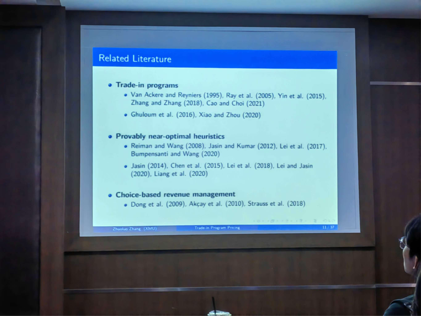 但在这些流程中,出现了定价困难的问题。张老师通过引用一系列文献资料,阐述了当前动态规划求解所面临的挑战及相应的解决策略,巧妙地将原问题进行了转换,把“以价格为约束”转变为“以选择概率为约束”,最后通过多种函数模型的运算验证了该方法的可行性。