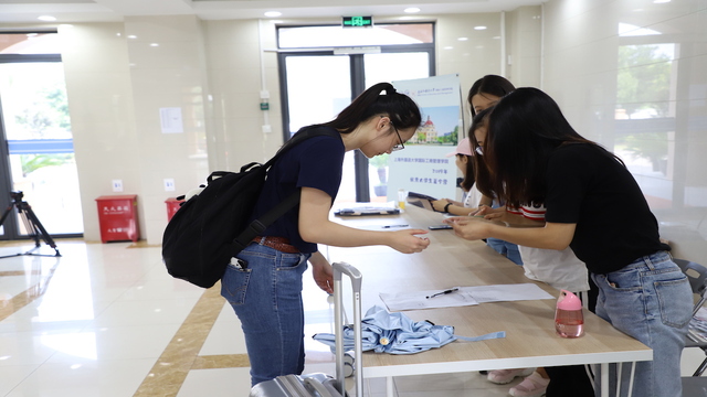 参加暑期学校的同学们在志愿者的指导下,填写报到注册信息,并领取相应的物资。