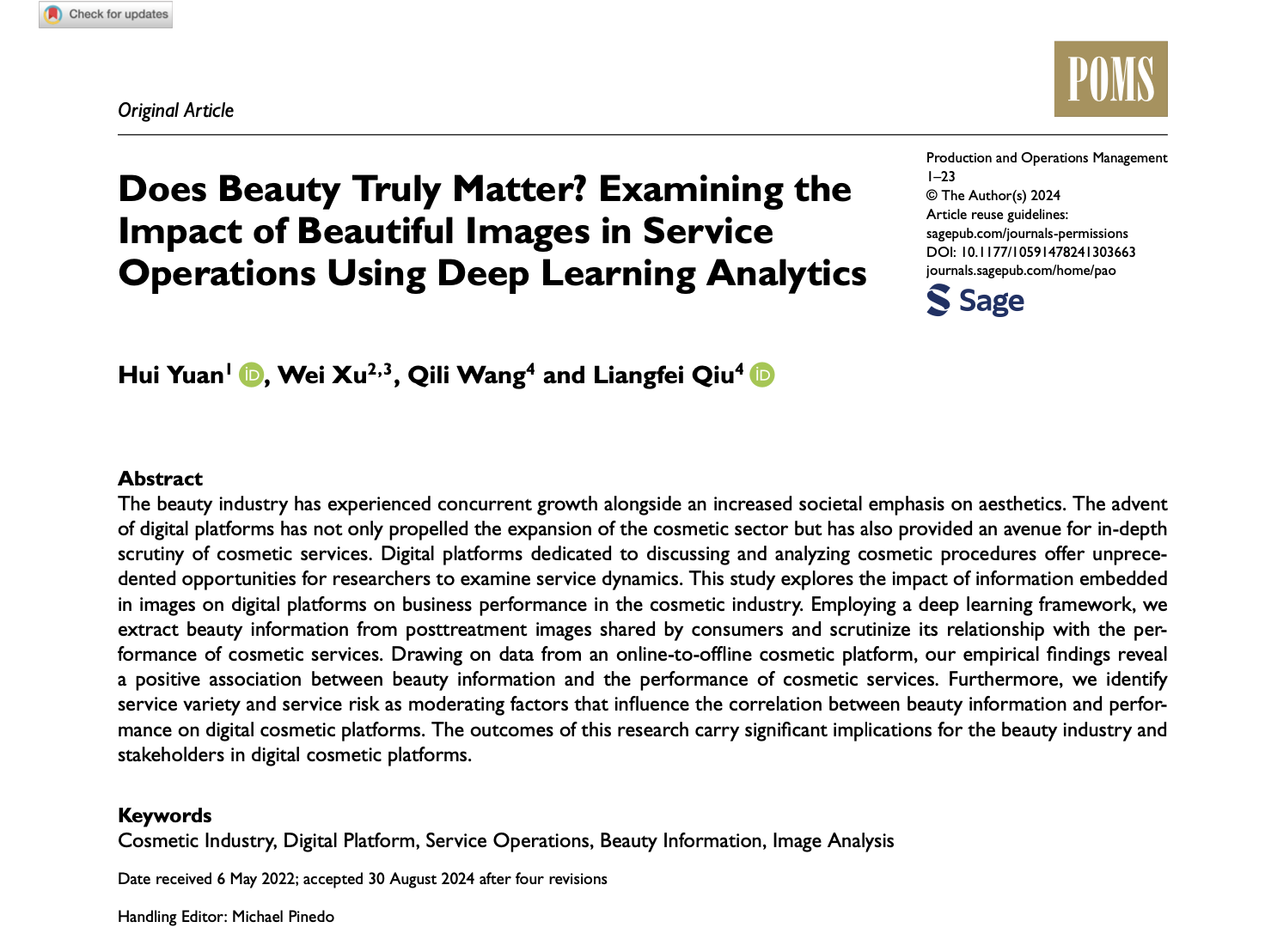 Yuan, H., Xu, W.*, Wang, Q., & Qiu, L. (2024). Does Beauty Truly Matter? Examining the Impact of Beautiful Images in Service Operations Using Deep Learning Analytics. Production and Operations Management. https://doi.org/10.1177/10591478241303663