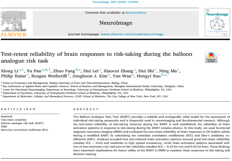 2020年1月,上海外国语大学脑与认知科学应用重点实验室、国际工商管理学院研究团队,以上海外国语大学为并列第一单位,在中科院一区期刊NeuroImage上发表学术论文“Test-retest reliability of brain responses to risk-taking during the balloon analogue risk task”。潘煜教授为本文共同第一作者,饶恒毅教授为本文通讯作者。https://doi.org/10.1016/j.neuroimage.2019.116495