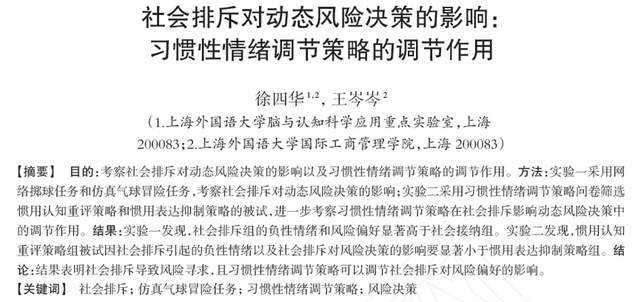 2019年6月,国际工商管理学院硕士研究生王岑岑,在其导师徐四华教授(消费行为与神经决策方向硕士生、博士生导师)的指导下,作为第二作者在CSSCI期刊《中国临床心理学杂志》上发表学术论文“社会排斥对动态风险决策的影响:习惯性情绪调节策略的调节作用”。此外,该生还以合作者身份与其导师(第一作者兼通讯作者)在SSCI一区期刊Psychophysiology和SCI二区期刊Cognitive, Affective, & Behavior Neuroscience发表了2篇学术论文。
